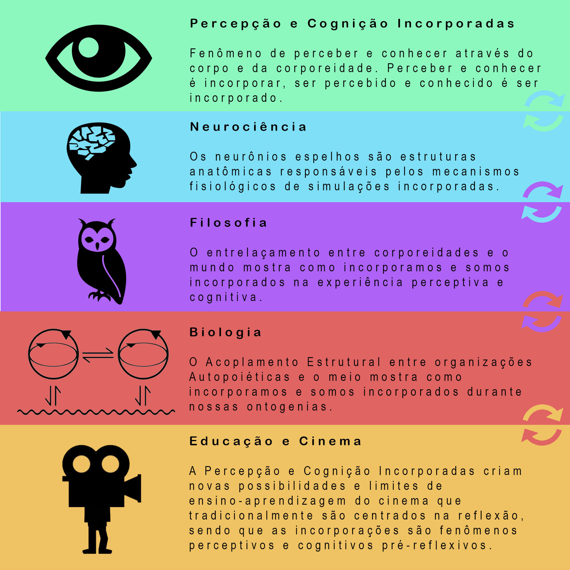 No âmbito anatômico e fisiológico as incorporações ocorrem através dos neurônios espelhos e dos mecanismos de simulações incorporadas. De acordo com Rizzolatti, Fogassi e Gallese (2001) os seres humanos entendem as ações intencionais, objetos, sensações e emoções que veem através de simulações sensório-motoras. Ou seja, os autores argumentam que as incorporações são mecanismos pré-reflexivos de entendimento que precedem as análises ou interpretações simbólicas.