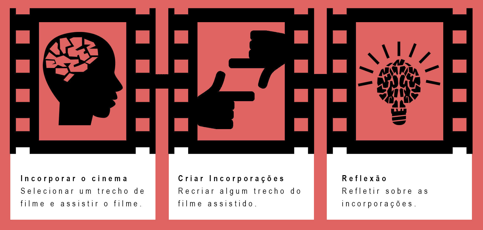 Os eixos principais do ensino-aprendizagem do cinema através da percepção e da cognição incorporadas são os corpos, as corporeidades e as experiências dos alunos, que servem como ponto de partida para reflexões posteriores. Para operacionalizar esta proposta criamos uma estrutura que prevê três momentos: 1) Incorporar o cinema, 2) Criar Incorporações; 3) Refletir sobre as incorporações.